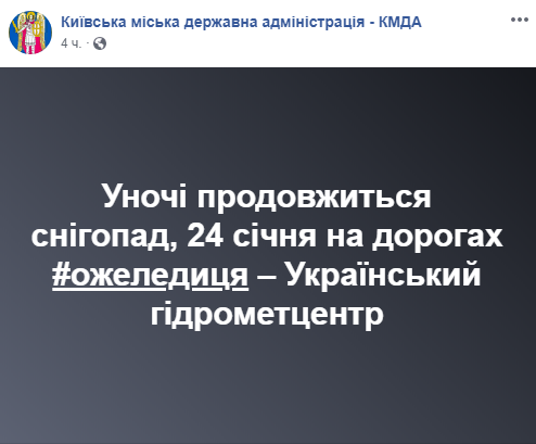 В Киеве в ночь на четверг, 24 января, ожидается снегопад, днем без осадков, на дорогах гололедица. Накануне в столице был зафиксирован грустный антирекорд по числу ДТП.