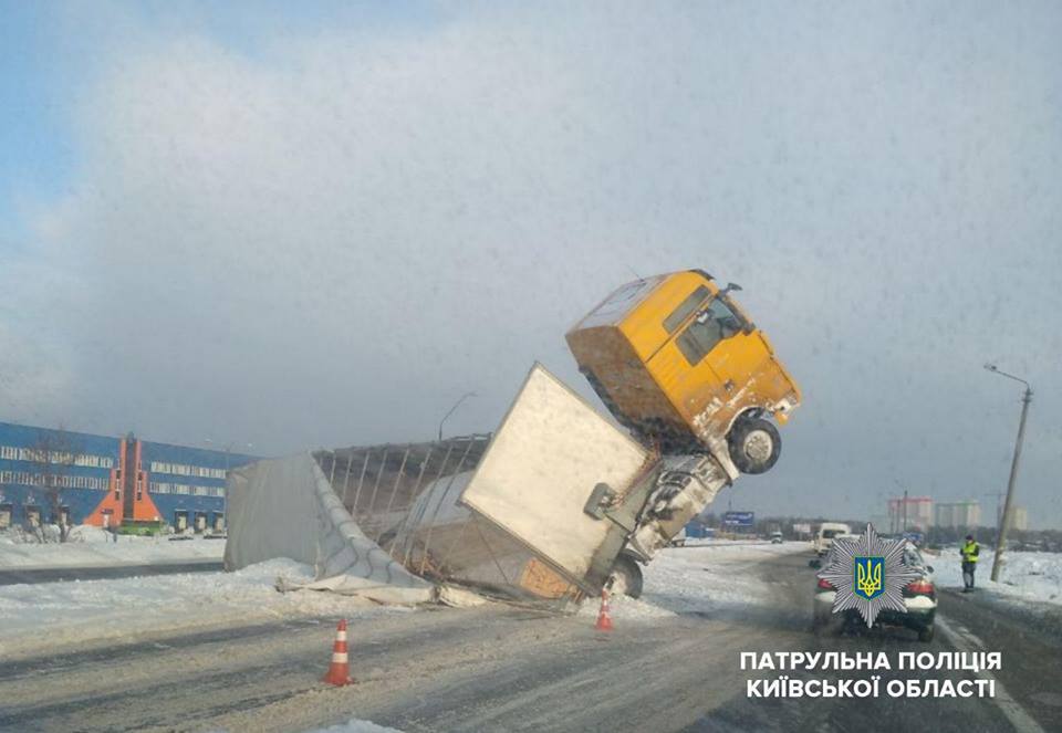 На трассе под Киевом утром 24 января из-за непогоды перевернулась и вертикально стала фура, поэтому было затруднено движение транспорта в направлении Броваров. Об этом сообщает пресс-служба патрульной полиции Киева.