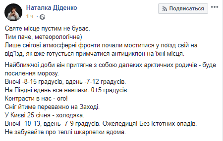 Напомним, в четверг, 24 января, в Украине наблюдаются гололед, мороз и местами снегопад.
