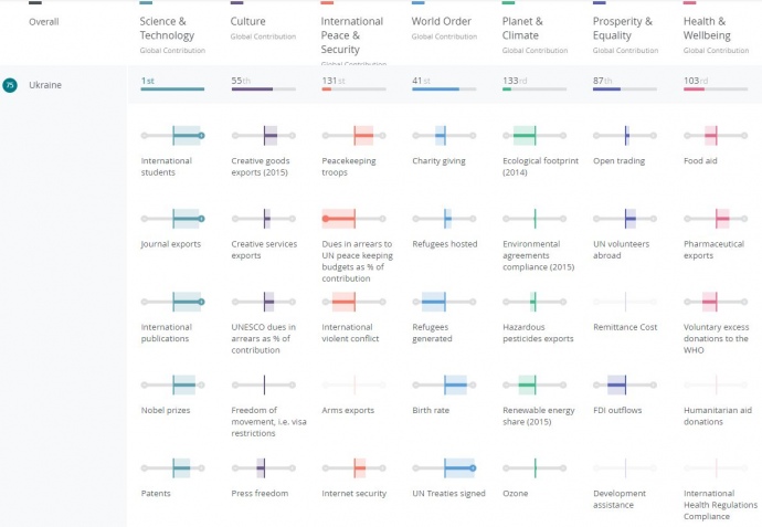 По процветанию и равенству Украина на 81 позиции, по вкладу в мировое здоровье и благосостояние - на 103-й, по вкладу в благополучие планеты и климата - на 133 позиции.