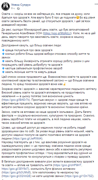 Образованные люди могут лучше позаботиться о своем организме. Об этом заявила на своей странице в Facebook глава МОЗ Ульяна Супрун.