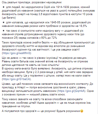 "Конечно, образование не влияет на здоровье изолированно. Действуют много факторов - социально-экономических, культурных и природных. Таких как уровень заработной платы или местность, в которой человек живет, имеют также значительное влияние на здоровье. Интересно, что лучший доступ к медицинским услугам не делает людей здоровыми сам по себе. При условии, что уровень образования низкий, даже доступные медицинские услуги не способны положительно влиять на здоровье человека. Ученые связывают это с тем, что важно понимание здоровья на индивидуальном уровне - к примеру, образованный человек может лучше осознавать риски вредных привычек или важность регулярно проходить профилактические осмотры. И поэтому отказывается от курения или употребления алкоголя и консультируется с врачом по поводу здоровья", - отметила Супрун.