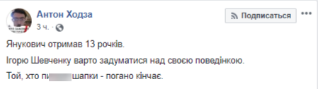 "Янукович получил 13 годков. Игорю Шевченко стоит задуматься над своим поведением. Тот, кто п...т шапки - плохо кончает",- написал Ходза.