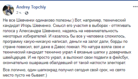 "Но натура взяла свое и технический кандидат технично украл 4 вязаные шапки у доверчивых швейцарцев. И не просто украл, а выложил свои подвиги в фейсбук, окончательно ошарашив обалдевший от такой наглости электорат. Все логично, один шапкокрад получил сегодня свой срок, но свято место пусто не бывает", - написал Топчий.