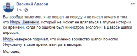 Журналист Василий Апасов также в комментарии вспоминает Януковича. "Игорь наверное подумал, что именно воровство шапок помогло Януковичу, в свое время, выиграть выборы. Молодец", - написал он.