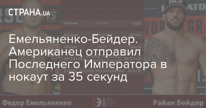 Но буквально первое же сближение на октагоне, и ударом с левой Бейдер попал в челюсть Емельяненко, рассек бровь, и добил своего соперника. После падения Емельяненко рефери остановил бой. Впрочем Федор избежал тяжелых травм, сам покинул арену и ушел в раздевалку.