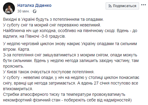 Последние выходные января в 2019 году будут достаточно теплыми, ожидается мокрый снег. Об этом на своей странице в Facebook сообщила синоптик Наталья Диденко.