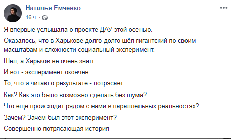 "Я впервые услышала о проекте ДАУ этой осенью. Оказалось, что в Харькове долго-долго шел гигантский по своим масштабам и сложности социальный эксперимент. Шел, а Харьков не очень знал. И вот – эксперимент окончен.