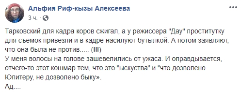 "Тарковский для кадра коров сжигал, а у режиссера "Дау" проститутку для съемок привезли и в кадре насилуют бутылкой. А потом заявляют, что она была не против... (!!!) У меня волосы на голове зашевелились от ужаса. И оправдывается отчего-то этот кошмар тем, что это "ыскуства" и "что дозволено Юпитеру, не дозволено быку", – пишут в Facebook.