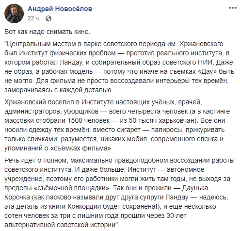 "Вот как надо снимать кино... Для фильма не просто воссоздавали интерьеры тех времен, заморачиваясь с каждой деталью. Хржановский поселил в Институте настоящих ученых, врачей, администраторов, уборщиков – всего четыреста человек. Все они носили одежду тех времен; вместо сигарет – папиросы, прикуривать только спичками; разумеется, никаких мобил, современного сленга и упоминаний о "съемках фильма". Речь идет о полном, максимально правдоподобном воссоздании работы советского института".