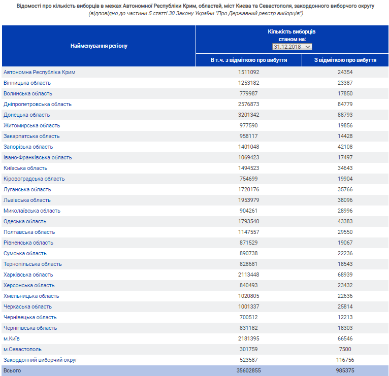 Ведомство подсчитало, сколько людей может проголосовать на выборах президента, которые состоятся в марте. Их будет около 35,6 миллионов. Причем сюда входят и проживающие на неподконтрольных территориях.