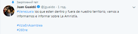 Лидер венесуэльской оппозиции Хуан Гуайдо заявил, что работа над законом об амнистии для граждан Венесуэлы закончилась, и в воскресенье, 27 января, он будет представлен депутатам и общественности.
