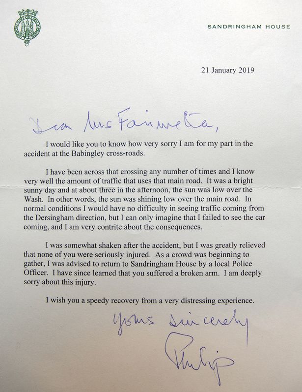 "Дорогая Миссис Фейруэзер, я хотел бы, чтобы вы знали, сколь глубокое сожаление я испытываю в связи с той ролью, которую я сыграл в аварии на перекрестке Бейбингли", - говорится в письме, которое герцог Эдинбургский подписал "Искренне ваш, Филип".