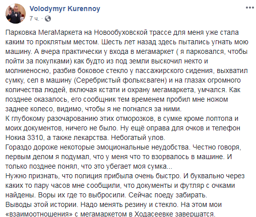 Неизвестный разбил боковое стекло и выхватил сумку с пассажирского сиденья. Сам Куренной не пострадал, похищенные документы были оперативно найдены полицией.