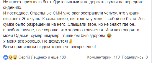 Народный депутат призвал всех быть бдительными и не держать сумки на передних сидениях. Также он опроверг слухи о похищении пистолета, которого, по его словам, при себе не было. В похищенной сумке было только разрешение на него.