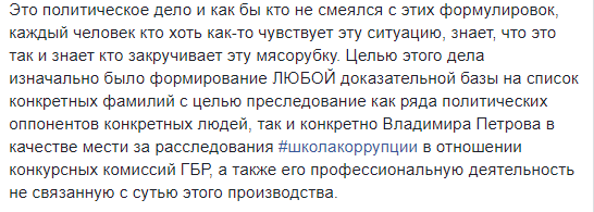 "Это политическое дело и как бы кто не смеялся с этих формулировок, каждый человек кто хоть как-то чувствует эту ситуацию, знает, что это так и знает кто закручивает эту мясорубку. Целью этого дела изначально было формирование любой доказательной базы на список конкретных фамилий с целью преследование как ряда политических оппонентов конкретных людей, так и конкретно Владимира Петрова в качестве мести за расследования #школакоррупции в отношении конкурсных комиссий ГБР, а также его профессиональную деятельность не связанную с сутью этого производства", - заявил Владимир Коваль.
