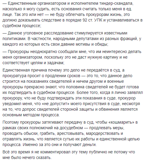 Коваль также признает себя единственным организатором и исполнителем тиндер-скандала, однако акцентирует, что это должно доказывать следствие в порядке 92 ст. УПК и устанавливаться в судебном процессе.