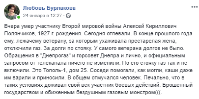 "У самого ветерана долгов не было. Обращения в "Днепрогаз" и горсовет Днепра и лично, и официальным запросом от телеканала ничего не изменили. По его стояку газ так и не включили. Это Тополь-1, дом 25. Соседи помогали, как могли, каши даже им варили и приносили. В общем отмучался человек. Печально, что в таких условиях доживал свой век участник боевых действий. Брошенный государством и обиженным бездушным газовым монстром", - написала Любовь Бурлакова.