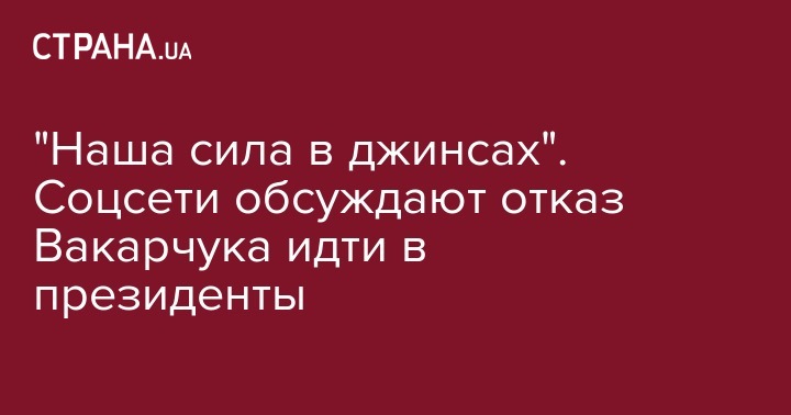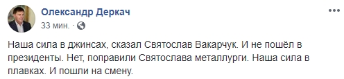 Блогер Александр Деркач шутит: "Наша сила в джинсах, сказал Святослав Вакарчук. И не пошёл в президенты. Нет, поправили Святослава металлурги. Наша сила в плавках. И пошли на смену".
