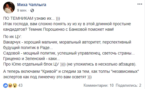 Но вернемся к более серьезным вещам. Политолог Михаил Чаплыга считает, что отказ Вакарчука от выборов - это технология Банковой. Он делает обзор тезисов, которые распространяют в Сети "порохоботы".