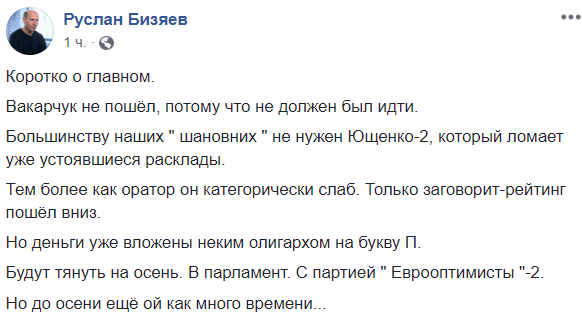 "Довакарился. Вакарчук таки не идёт - уже официально. Но возможность стать вип-агитатором не закрывает: "Разом з моєю командою, я працюватиму над тим, щоб проєвропейські сили перемогли. Я працюватиму над тим, щоб привести у владу якомога більше молодих професіоналів – людей майбутнього, тих, для кого справедливість і державні інтереси – понад усе."