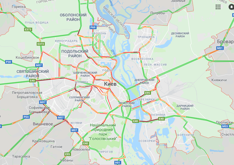 Самые крупные заторы, как и обычно, наблюдаются в центре столицы, в частности, на улицах Вадима Гетьмана, Сечевых Стрельцов, Вячеслава Чорновола, Воздухофлотском проспекте, проспектах Академика Глушакова и Валерия Лобановского.