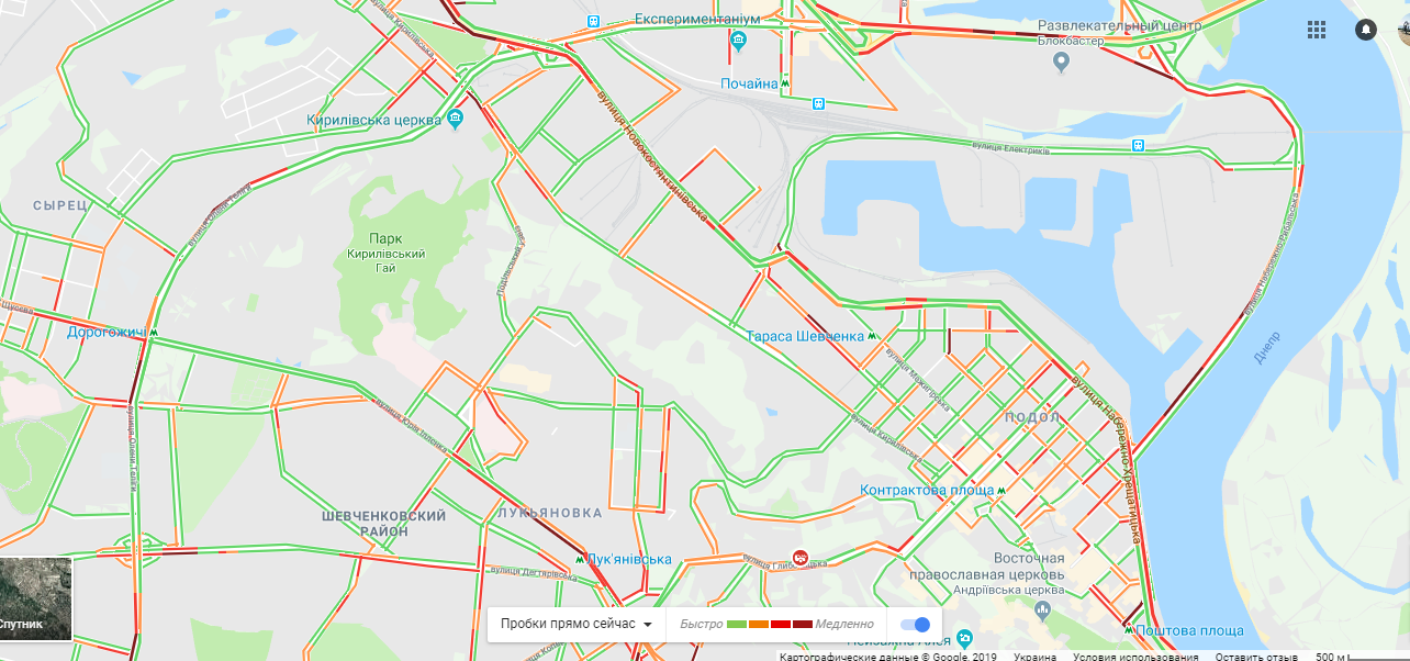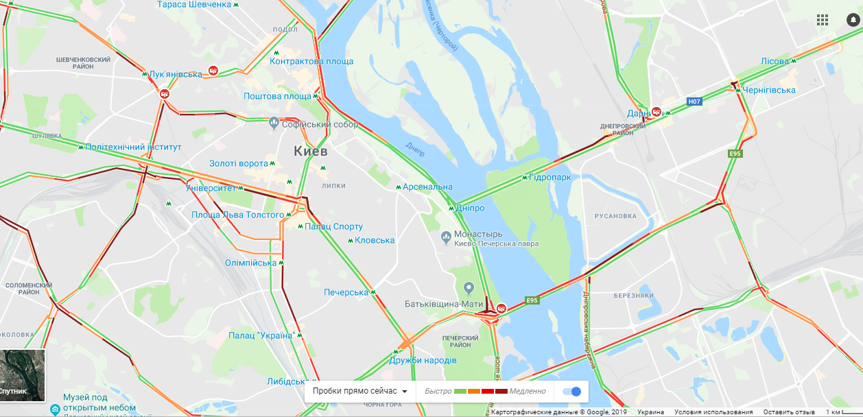 На левом берегу столицы затруднено движение на проспектах Соборности, Освободителей, Дарницком шоссе, улице Раисы Окипной, Хоткевича, проспекте Николая Бажана, Днепровской и Русановской набережной, улице Здолбуновской, Анны Ахматовой, Броварском проспекте.