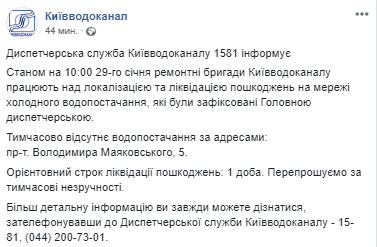 Во вторник, 29 января, один из жилых домов Киева остался без холодного водоснабжения из-за повреждений водопровода.  Об этом сообщается на странице Киевводоканала в соцсети.