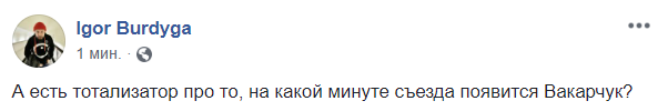 16:09  "А есть тотализатор про то, на какой минуте съезда появится Вакарчук?", - спрашивают в соцсетях.