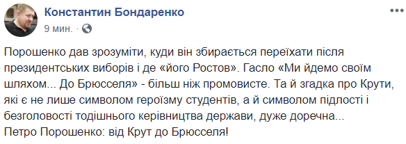 "Порошенко дал понять, куда он собирается переехать после президентских выборов и где "его Ростов". Лозунг "Мы идем своим путем ... В Брюссель" - более чем красноречивое. И упоминание о Крутах, которые являются не только символом героизма студентов, но и символом подлости и безголовости тогдашнего руководства государства, очень уместна.