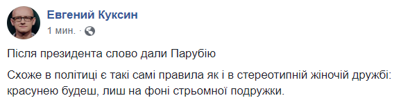 15:08  "После президента слово дали Парубию. Похоже в политике есть такие же правила, как и в стереотипной женской дружбе: красавицей будешь лишь на фоне стремной подружки", - пишет журналист Евгений Куксин.
