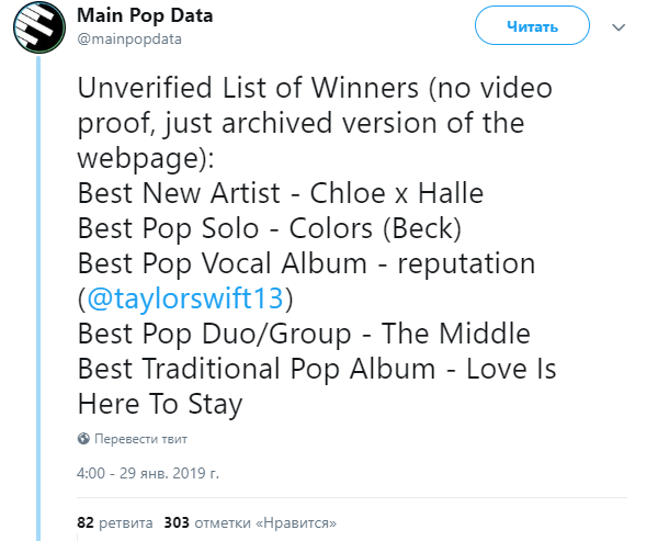 Согласно этому списку, песней года станет композиция "Shallow" Леди Гаги и Брэдли Купера, лучшей записью - "I Like It" американской хип-хоп-исполнительницы Карди Би. Награду за лучший альбом, если верить списку, получит американская певица H.E.R., премию за лучший поп-альбом - Тейлор Свифт. В комментарии под роликом было отмечено, что премию также получат Arctic Monkeys, Fall Out Boy, Beck. Дуэт Chloe x Halle может стать прорывом года.