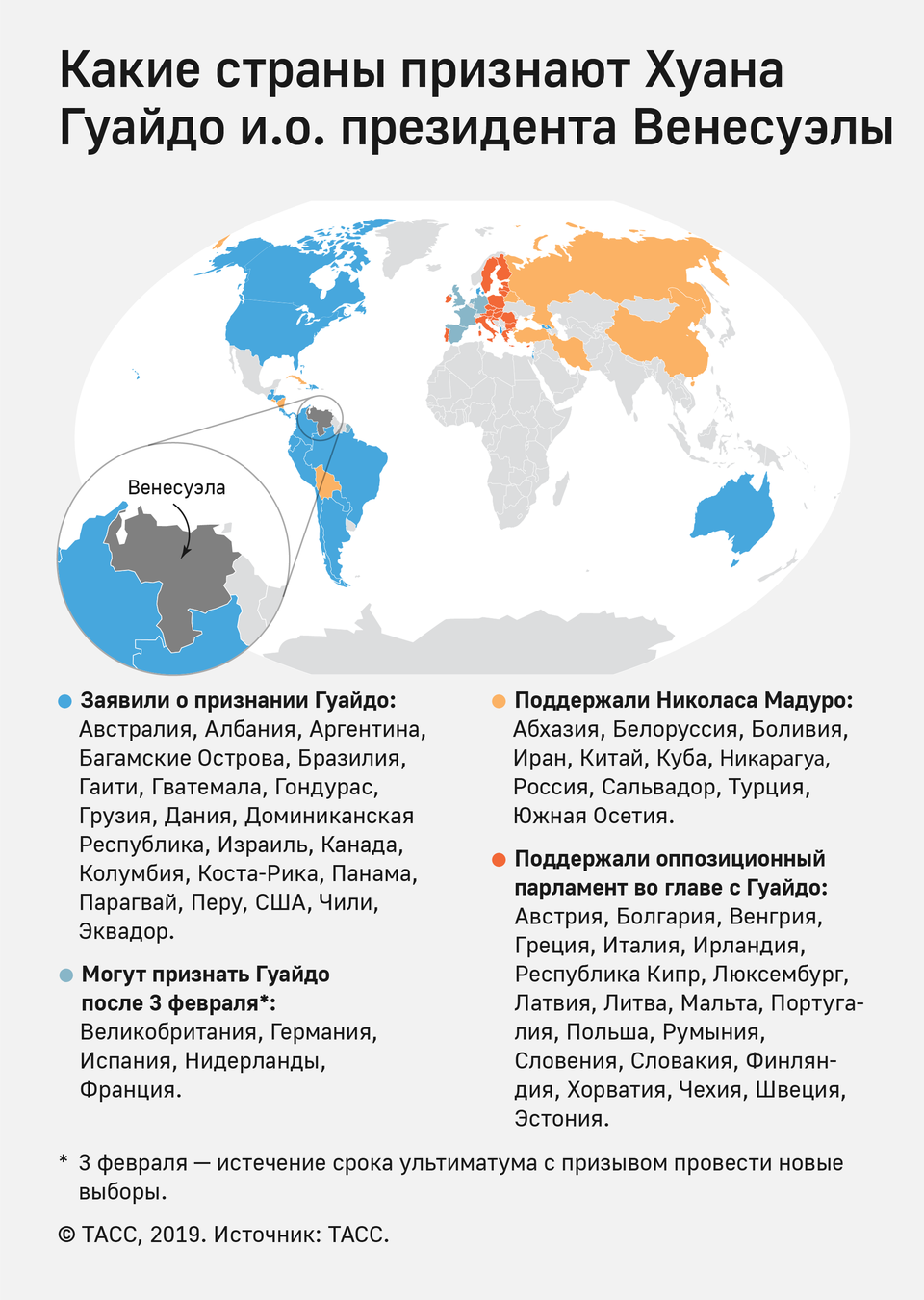 В Госдепе США также призвали другие правительства признать Хуана Гуайдо временно исполняющим обязанности венесуэльского президента и предпринять аналогичные шаги.