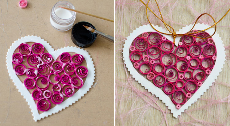Традиционный атрибут праздника - открытки в форме сердца - валентинки. Обычно они бывают розового или красного цвета. Можно купить готовую или сделать валентинку своими руками. Например, вырезать из картона ажурную рамочку-сердце, аккуратно уложить ее на стол и заполнить скрученными из цветной бумаги спиральками. Чтобы они держались - каждую нужно промазать клеем ПВА, а в конце и все сердце с одной стороны, добавляя спиральки там, где образовались незаполненные пустоты. Излишек клея промокните салфеткой и оставьте сердце сушиться на клеенке, файле или другой поверхности, к которой оно не приклеится.
