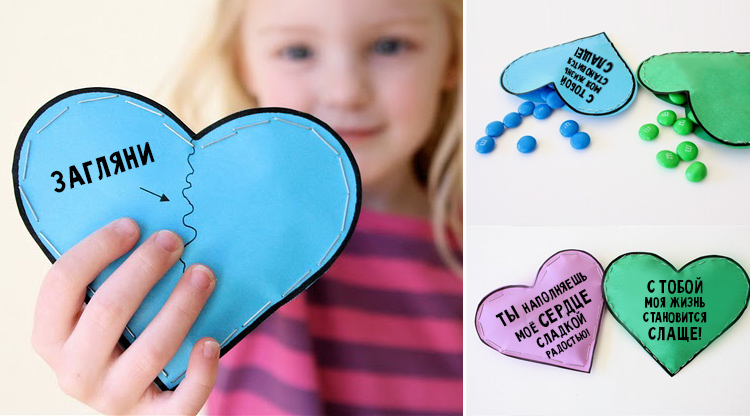 Еще один вариант - зашитое сердце из цветной бумаги с оригинальной надписью, внутри которого сладкие конфетки типа M&M's.