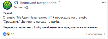 А уже около 10:40 в КП "Киевский метрополитен" сообщили, что проверка была проведена, взрывоопасных предметов не обнаружили, указанная станция и пересадка открыты на вход и выход.