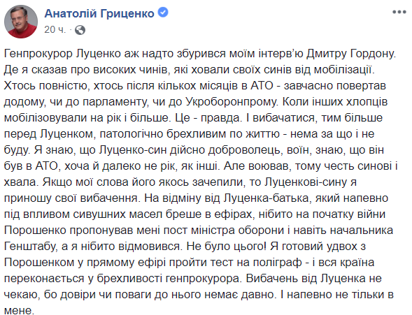 "В отличие от Луценко-отца, который наверняка под воздействием сивушных масел врет в эфирах, якобы в начале войны Порошенко предлагал мне пост министра обороны и даже начальник Генштаба, а я якобы отказался. Не было этого! Я готов вдвоем с Порошенко в прямом эфире пройти тест на полиграфе - и вся страна убедится в лживости генпрокурора. Извинений от Луценко не жду, ибо доверия или уважения к нему нет давно. И наверное не только у меня", - резюмировал Гриценко.