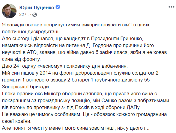 "Я всегда считал недопустимым использовать семьи в целях политической дискредитации. Но сегодня узнал, что кандидат в президенты Гриценко, пытаясь ответить на вопрос Д. Гордона о причинах его неучастия в АТО, заявил, что война давно бы закончилась, если бы я не скрывал сына от фронта. Даю 24 часа "честному" полковнику для прощения", - заявил Луценко в Facebook. Он также отметил, что его сын пошел на фронт в 2014 году добровольцем.