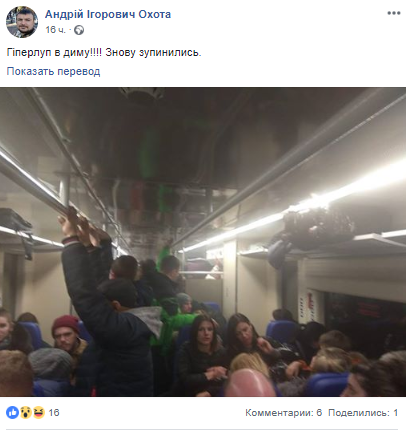 По словам Охоты, через полчаса поезд продолжил движение, однако вскоре снова остановился, а салоне экспресса заполнился дымом.