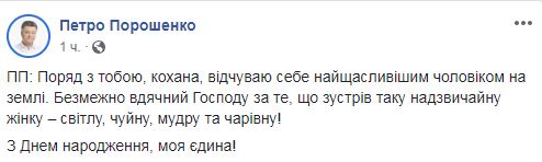 В пятницу, 1 февраля, президент Украины Петр Порошенко публично поздравил жену Марину с днем рождения. Текст поздравления с обнимающейся парой размещен на официальной станице президента в Facebok.