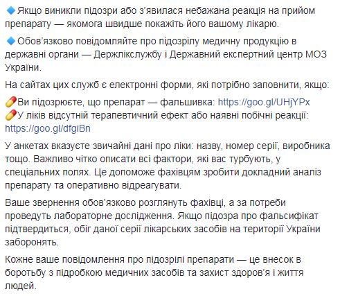 Она обещает, что обращение обязательно рассмотрят специалисты, а при необходимости проведут лабораторное исследование. Если подозрение о фальсификате подтвердится, оборот данной серии лекарственных средств на территории Украины запретят.