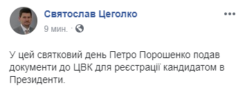 "В этот праздничный день Петр Порошенко подал документы в ЦИК для регистрации кандидатом в президенты", - написал он.