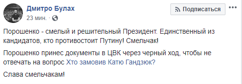 "Порошенко - смелый и решительный Президент. Единственный из кандидатов, кто противостоит Путину! Смельчак! Порошенко принес документы в ЦИК через черный ход, чтобы не отвечать на вопрос Хто замовив Катю Гандзюк? Слава смельчакам!" - написал он.
