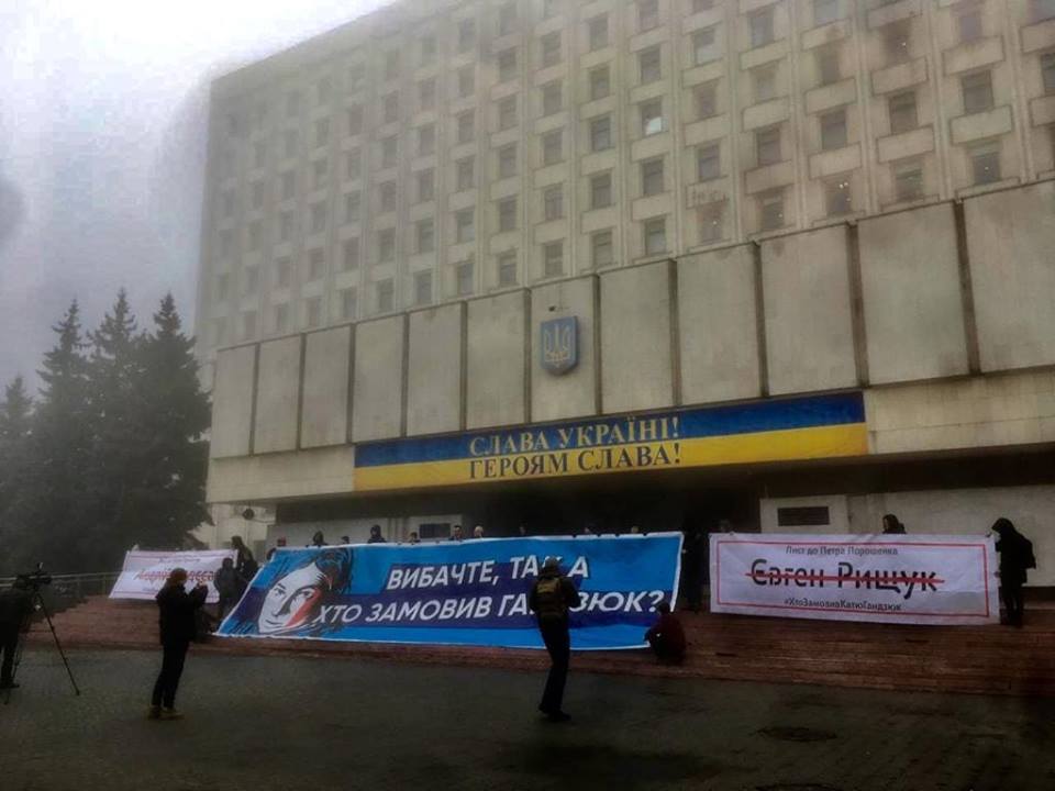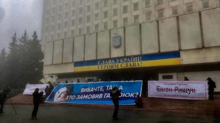 Перед зданием ЦИК активисты развернули огромный плакат с надписью: "Извините, так кто же заказал Гандзюк?"