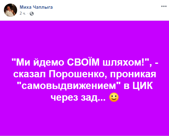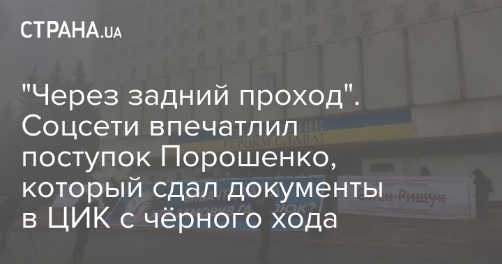 "Сказал - сделал! Реальные дела, а не пустые обещания! Мы идем своим путем! Это все о Петр Порошенко, который зашел в ЦИК "своим путем". Этим путем оказался черный (задний, запасной, тайный, служебный, - правильное подчеркнуть) вход", - пишет журналист Алексей Братущак.
