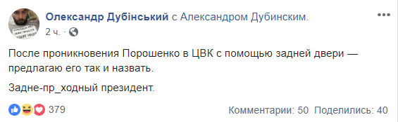 "После проникновения Порошенко в ЦВК с помощью задней двери - предлагаю его так и назвать. Задне-пр_ходный президент", - пишет Дубинский.