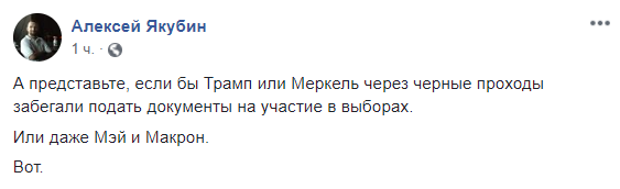 "А представьте, если бы Трамп или Меркель через черные проходы забегали подать документы на участие в выборах. Или даже Мэй и Макрон. Вот", - задает риторический вопрос преподаватель КПИ Алексей Якубин.