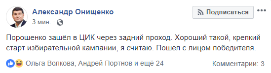 "Порошенко зашёл в ЦИК через задний проход. Хороший такой, крепкий старт избирательной кампании, я считаю. Пошел с лицом победителя", - иронизирует беглый народный депутат Александр Онищенко.