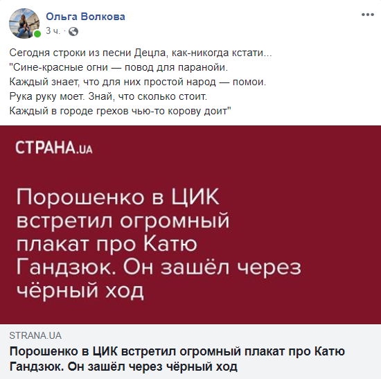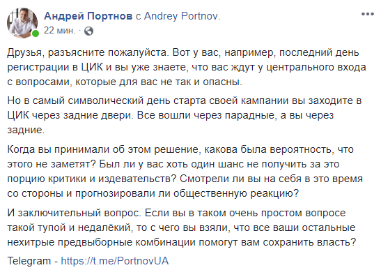 "Порошенко - смелый и решительный Президент. Единственный из кандидатов, кто противостоит Путину! Смельчак! Порошенко принес документы в ЦИК через черный ход, чтобы не отвечать на вопрос Хто замовив Катю Гандзюк? Слава смельчакам!", - написал об этом в Facebook блогер Дмитрий Булах.