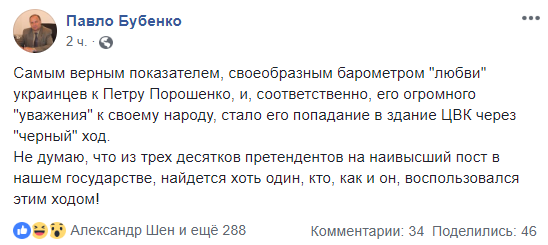 "Самым верным показателем, своеобразным барометром "любви" украинцев к Петру Порошенко, и, соответственно, его огромного "уважения" к своему народу, стало его попадание в здание ЦВК через "черный" ход. Не думаю, что из трех десятков претендентов на наивысший пост в нашем государстве, найдется хоть один, кто, как и он, воспользовался этим ходом!", - возмущен ученый Павел Бубенко.